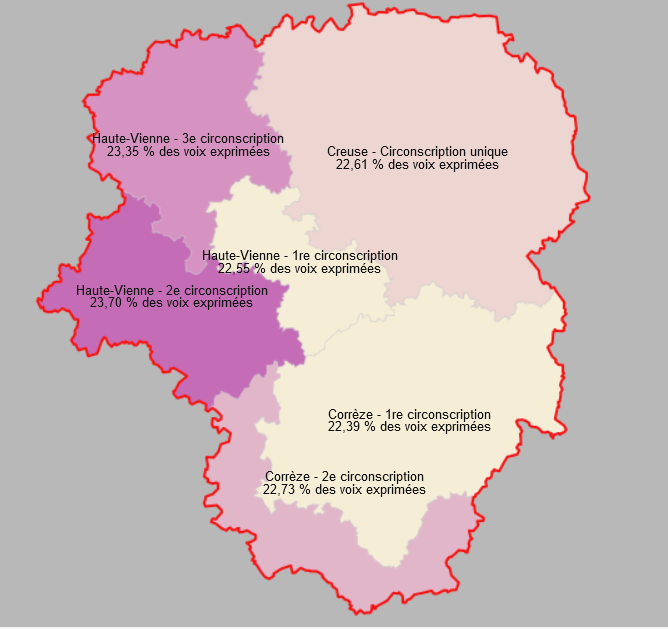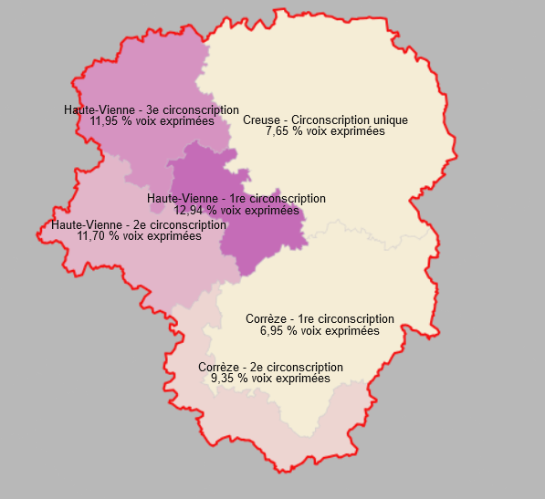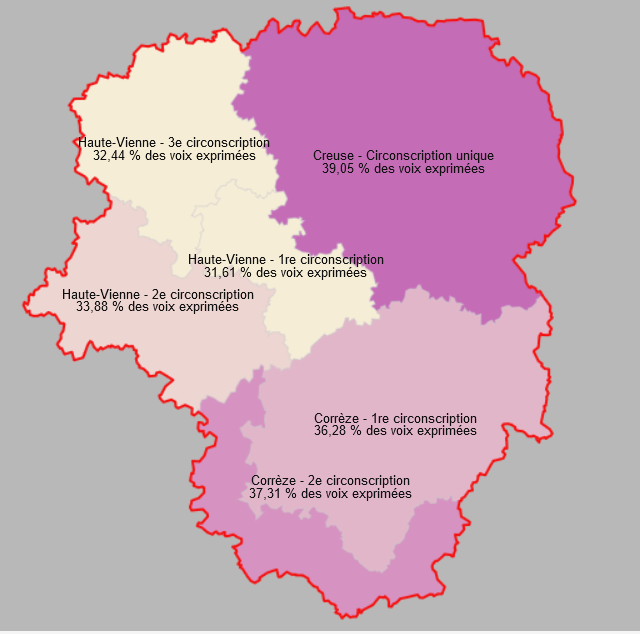 Je livre ici quelques données de façon un peu brute, relatant un travail de reconstruction des résultats électoraux récents à l’échelle des bureaux de vote (seule unité capable de faire le lien entre des scrutins à circonscription nationale – européennes de 2019, présidentielles de 2022 – ou à circonscription régionale – régionales de 2021). Les circonscriptions législatives agissent aujourd’hui comme des unités un peu fictives (la fin du cumul des mandats interdit de les considérer comme des territoires politiquement signifiants) ce qui les livre d’autant plus à différentes spéculations (circonscriptions « gagnables », « imprenables ») que ces quelques données peuvent permettre de discuter. La question centrale pourrait être de savoir si les données de long terme depuis 2012 indiquent la possibilité que la gauche puisse re(gagner) une ou plusieurs circonscriptions en Limousin ? Wait and see.