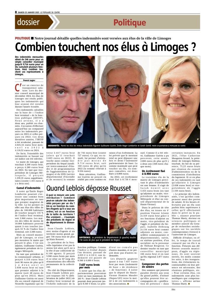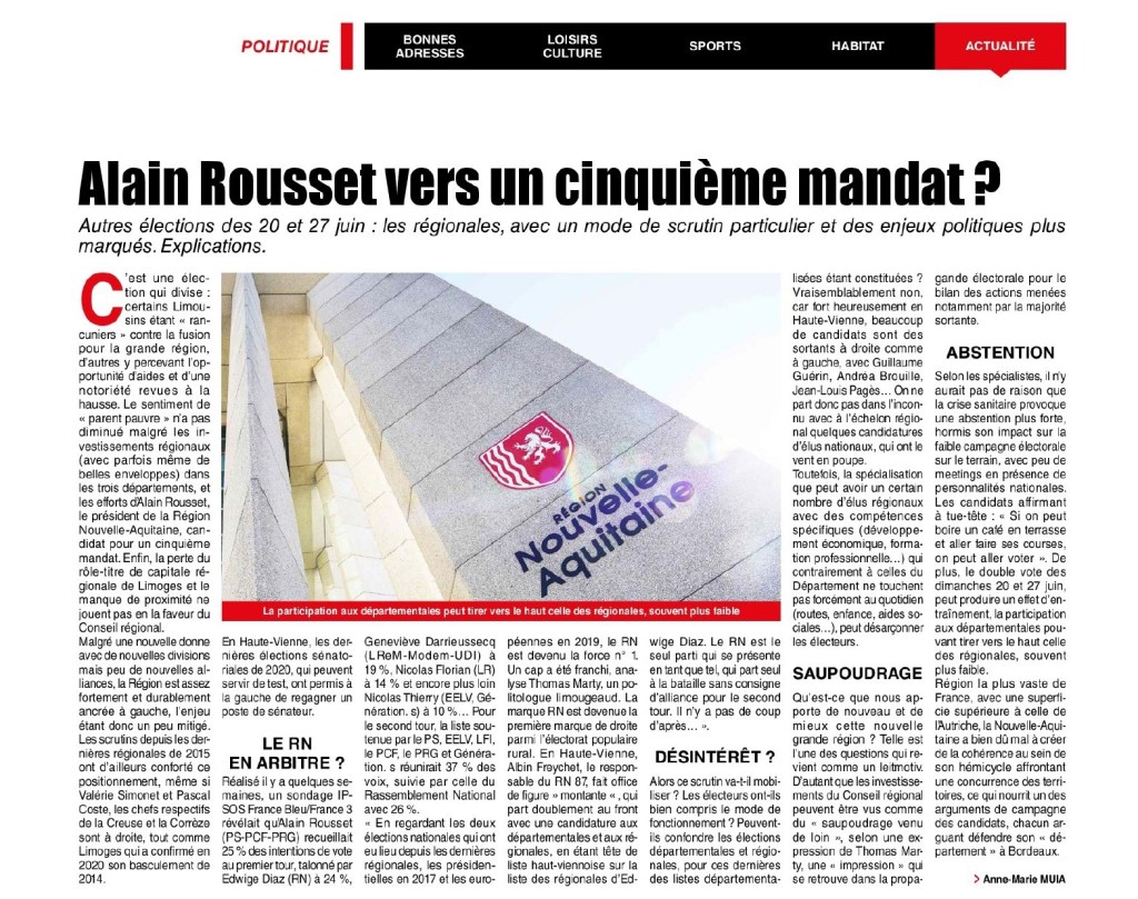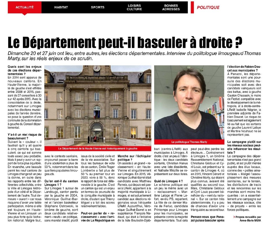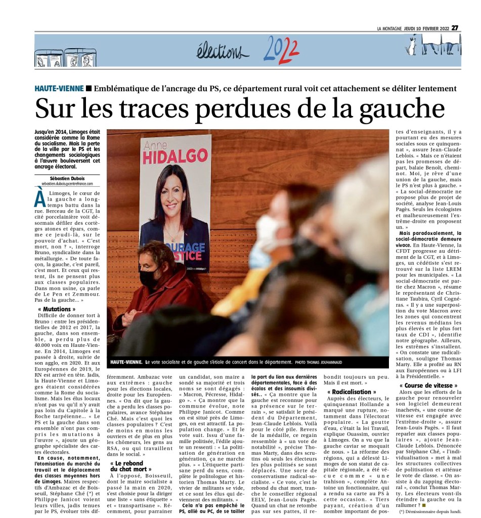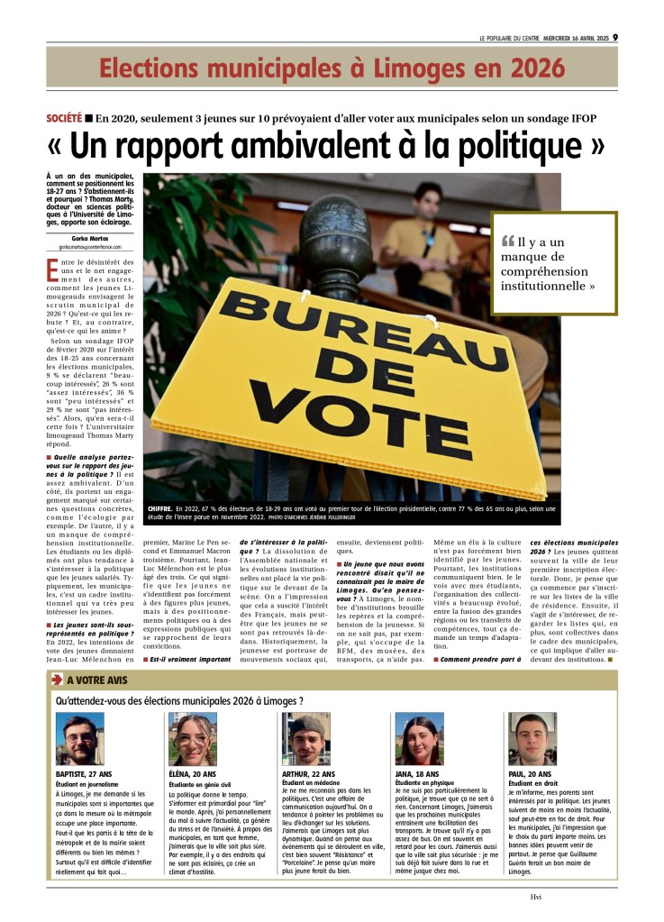 Presse écrite Collaborations avec la presse écrite locale en Limousin, articles en relation avec des enseignements. 2023 – 2025 Le populaire du centre, 11 juin 2024 sur les élections européennes Le populaire du centre, 25 janvier 2025, sur les indemnités des élus locaux Le populaire du centre, 16 avril 2025, sur le vote des jeunes 2020- 2022 Le populaire du centre, 10 février 2021 (sur l’évolution électorale et militante du socialisme en Haute-Vienne) Limoges info, juin 2021 (à propos des élections départementales en Haute-Vienne) Limoges info, juin 2021 (à propos des élections régionales en Nouvelle-Aquitaine vues depuis Limoges) Le populaire du centre, 14 juin 2021 (à propos des élections départementales) 2020 : élections municipales La Montagne, février 2021 La Montagne, février 2021 Archives La Montagne, 7 juin 2017 La Montagne, 3 juin 2017 L’écho du centre, mai 2017 Partager : Cliquer pour partager sur X(ouvre dans une nouvelle fenêtre) X Cliquez pour partager sur Facebook(ouvre dans une nouvelle fenêtre) Facebook J’aime chargement…